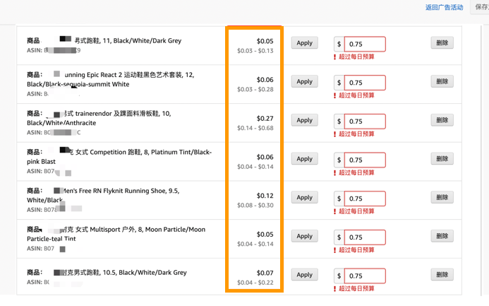 Running shoes的流量成本:特定ASIN