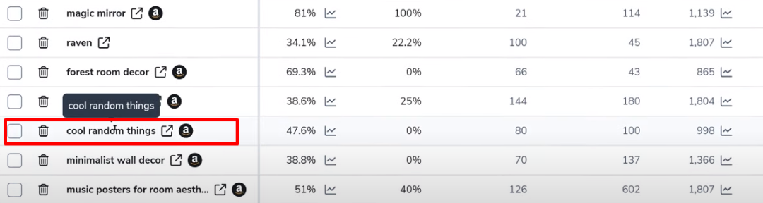 在结果中,我们可以看到词频一栏展示了不同词根出现的频率,最热门的词依次为“decor、shelf、coffin”,这个信息为后期的关键词投放提供了有效凭证。