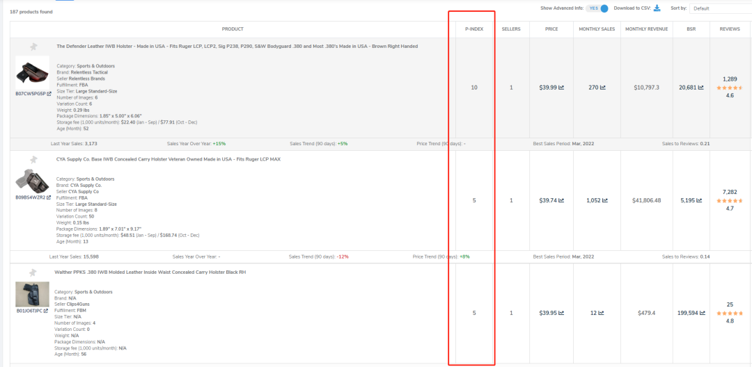 输入ASIN就可以找到这个ASIN最相关的竞争对手,其中有一个叫做P-INDEX(竞争指数)的参数,满分为10分,分数越高证明这个产品跟你用于反查的ASIN的竞争程度越高