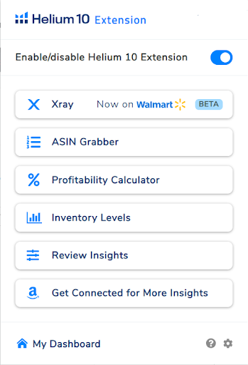 Helium 10 谷歌插件是一款安装在谷歌浏览器上面的工具,它的好处是简单快捷清晰的看到当前亚马逊和沃尔玛页面当中的产品销售表现,包括:产品的利润、FBA 费用、评论数据、库存等