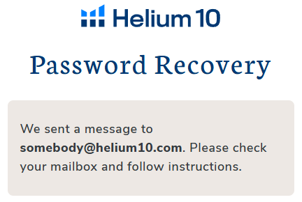如果输入的电子邮件地址是真实的,您将收到一条消息,提醒您Helium 10已向您的收件箱发送了一个链接,您可以使用该链接重置密码。