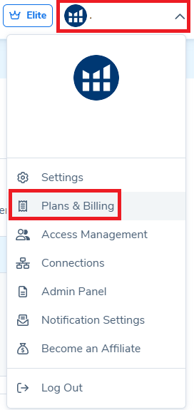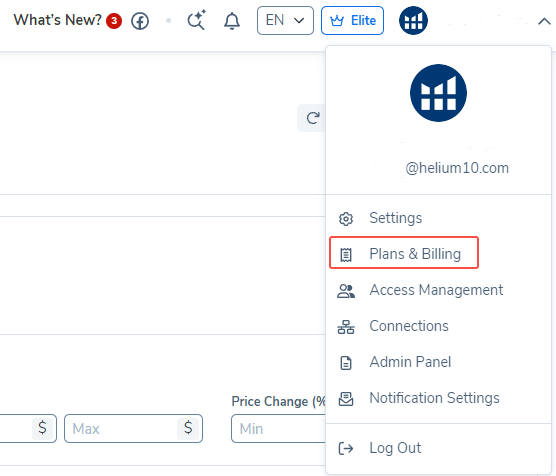 1. 从Helium 10主仪表板,点击右上角的会员资料图标。在下拉菜单中,选择计划与账单。