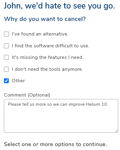 4. 按照提示说明您暂停订阅的原因,并向Helium 10提供反馈。然后,在右下角选择继续。