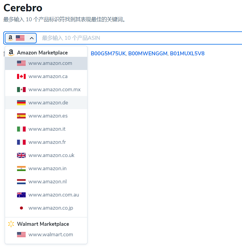 首先,在箭头处可以选择用于反查的ASIN所在的市场:目前支持12个亚马逊站点和沃尔玛美国站