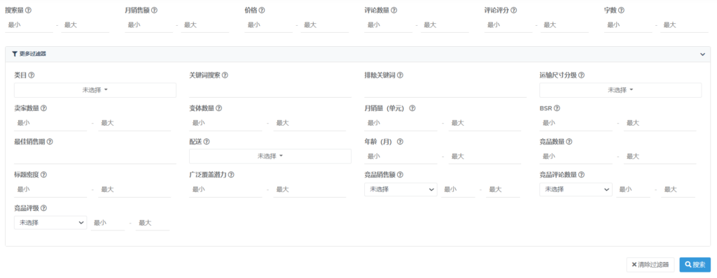 如果您想通过Helium 10大数据来选品,可以使用这个工具,此工具一共分为两个模块:参数设置模块和搜索结果模块